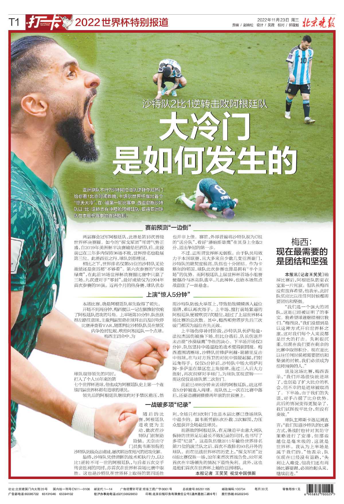 北京时间11月22日,卡塔尔世界杯爆出开赛以来最大冷门,夺冠热门之一的阿根廷队1比2不敌沙特队。