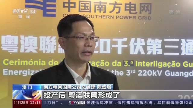 南方电网国际公司总经理 陈盛燃:投产后,粤澳联网形成了“南、北、中”三条通道的输电格局,内地对澳门的供电可靠性就更高了,即便发生台风、地震灾害等极端情况,其中任何一条输电通道中断,无法发挥作用,我们依然可以通过双通道,来保证电网的安全稳定运行。
