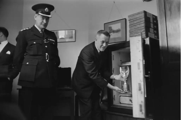 虽然奖杯在世界大战中幸存下来。但在1966年世界杯前四个月的英国巡回展中,雷米特杯失窃。一周后,一条名叫“皮克勒斯”(Pickles)的牧羊犬找到了这座胜利女神杯。