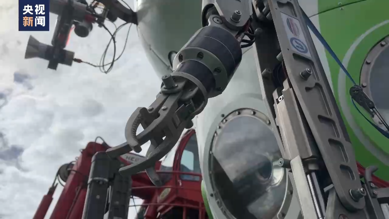 总台记者 金东:现在我要来揭晓这个套子里面的机械手臂,在潜水器潜到海底之后用机械手臂拿取海底的海洋生物样本,为科学实验提供帮助。