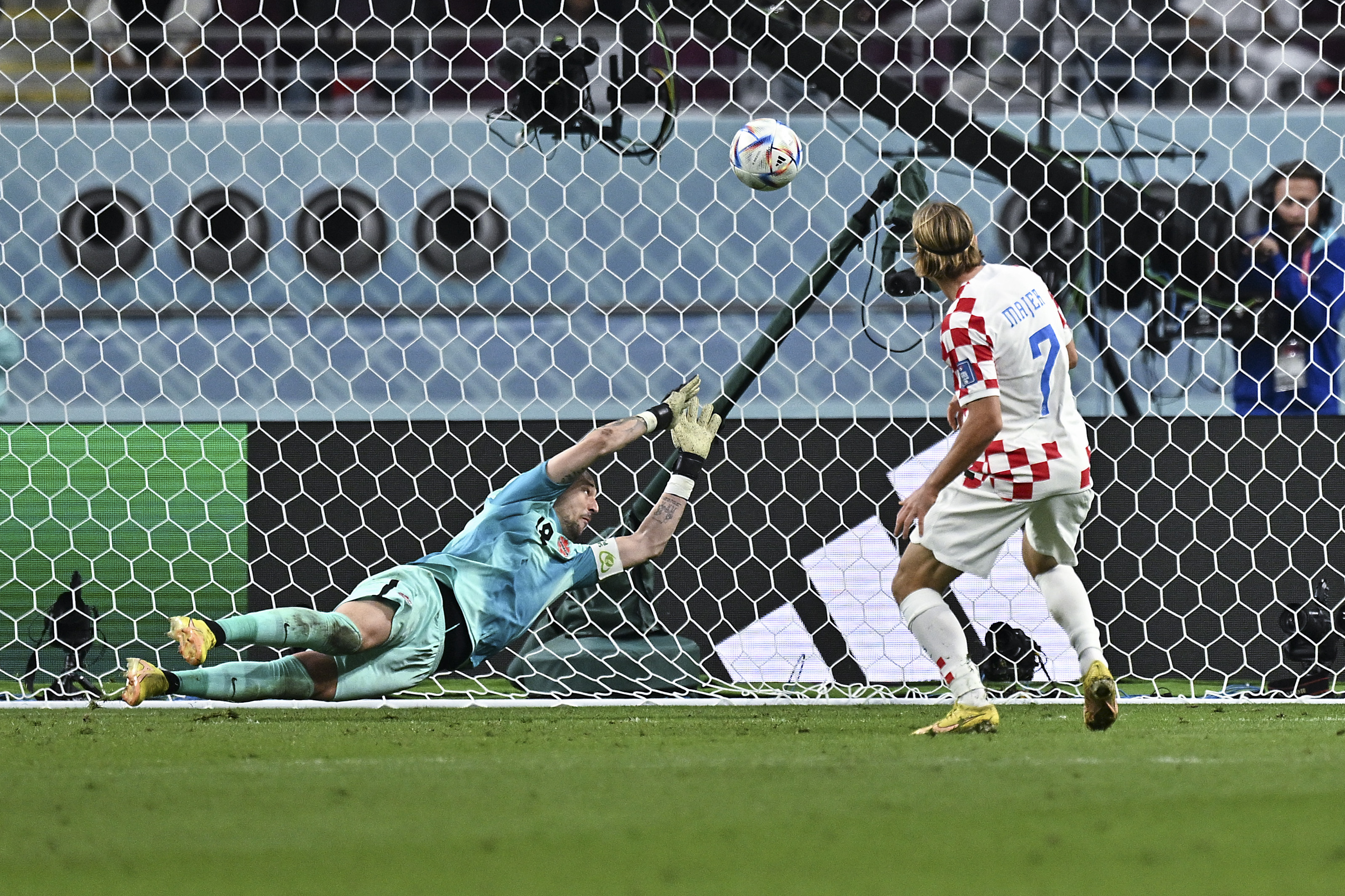 11月27日,克罗地亚队球员马耶尔(右)在比赛中射门得分。新华社记者辛悦卫摄