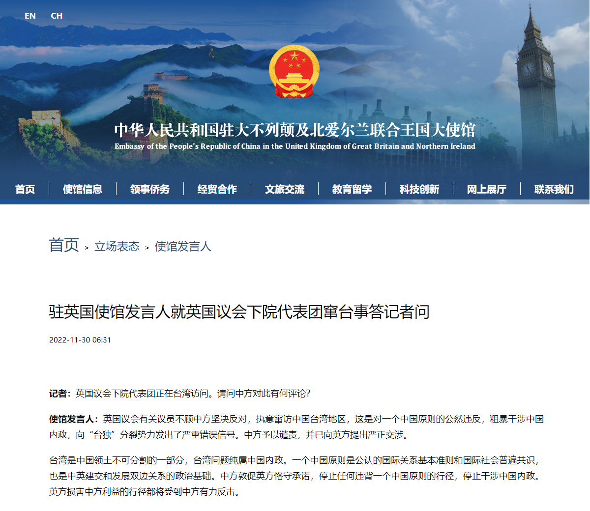 使馆发言人:英国议会有关议员不顾中方坚决反对,执意窜访中国台湾地区,这是对一个中国原则的公然违反,粗暴干涉中国内政,向“台独”分裂势力发出了严重错误信号。中方予以谴责,并已向英方提出严正交涉。