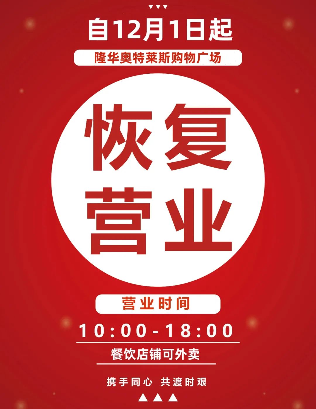 12月1日起,隆华奥特莱斯购物广场恢复营业,营业时间为10:00-18:00。顾客进入商场,需扫码北京健康宝、出示48小时内核酸阴性证明。