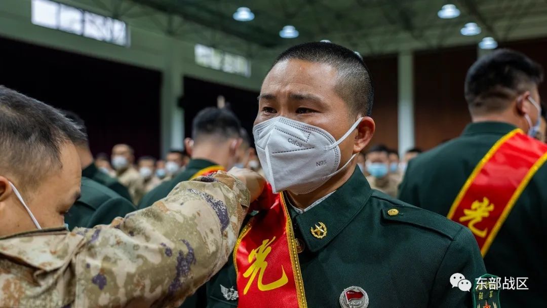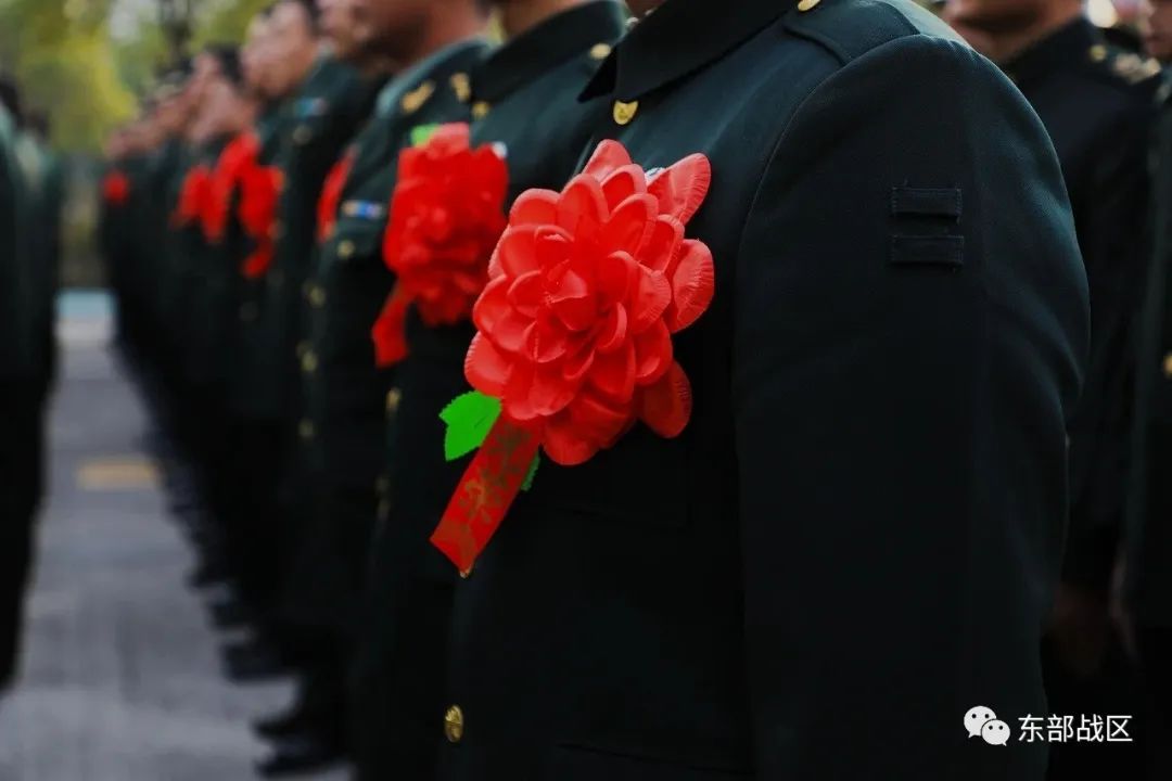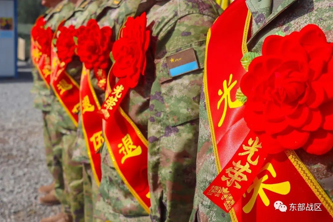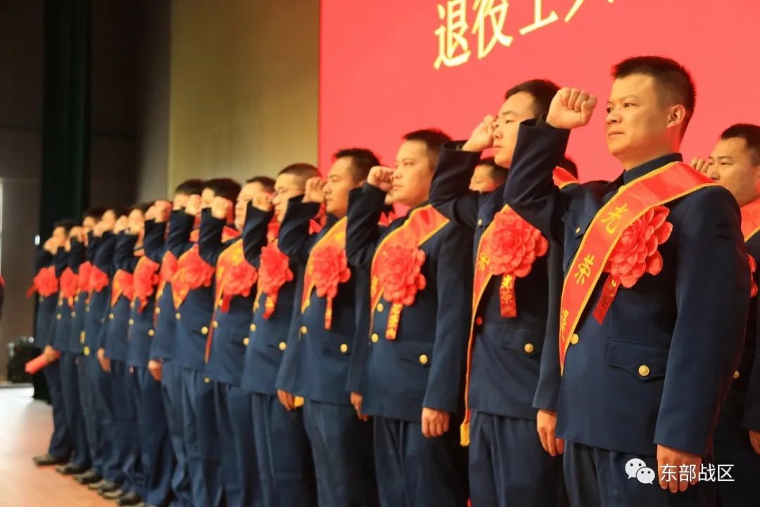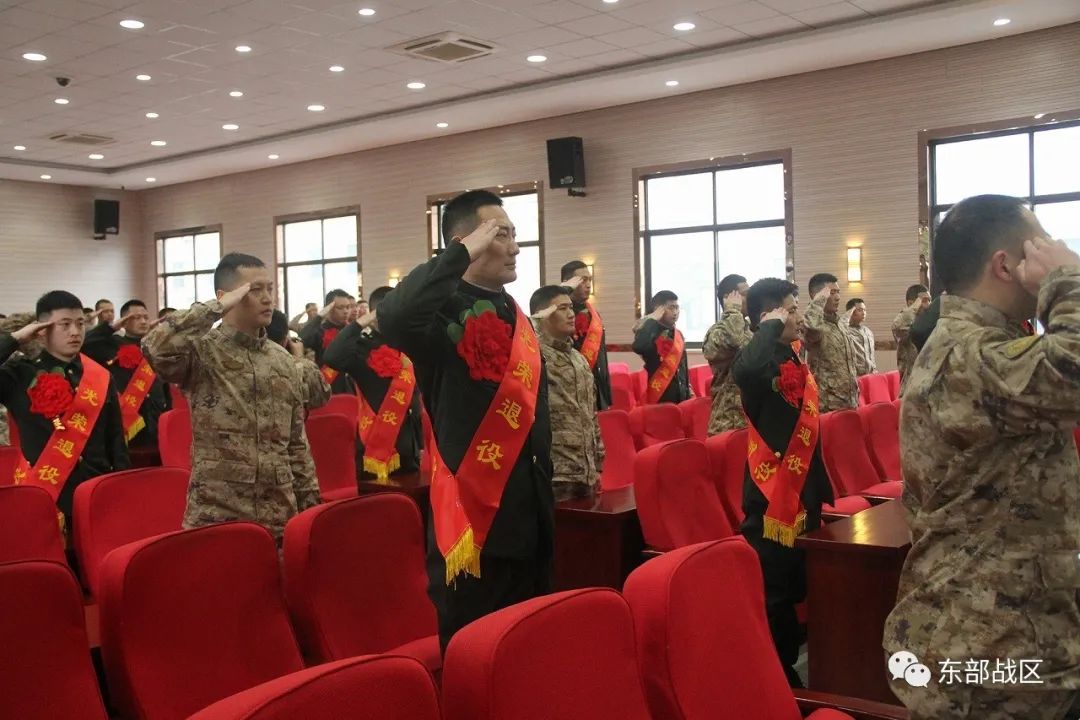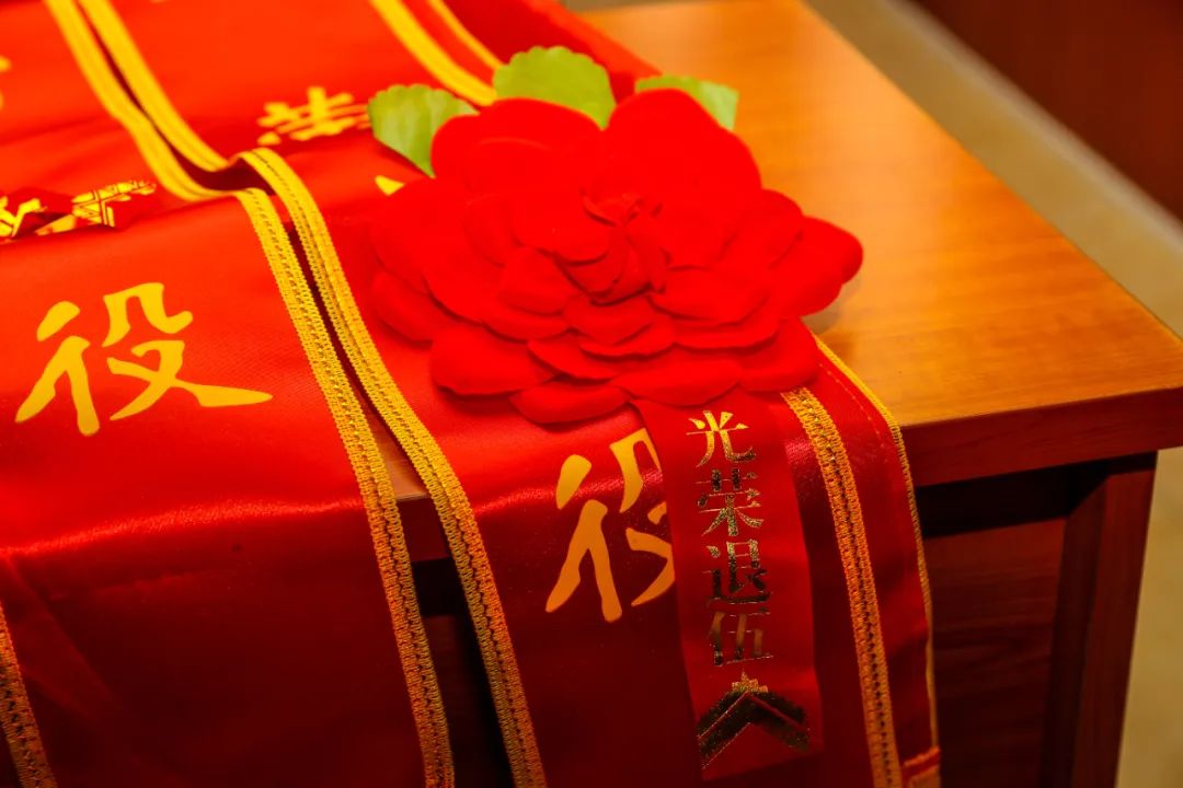 退役士兵身披绶带、胸戴红花