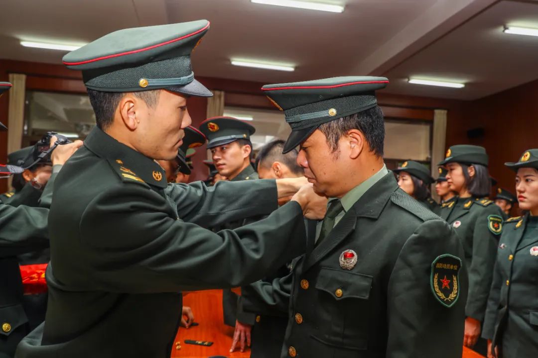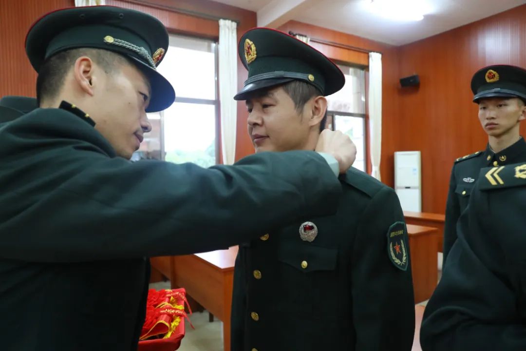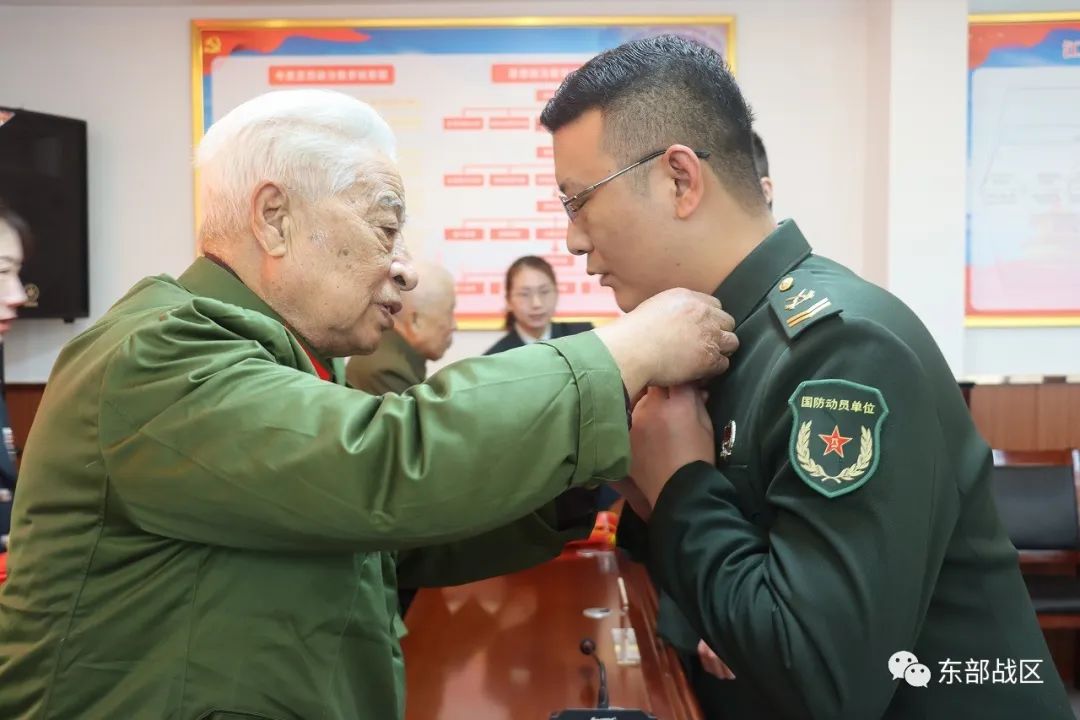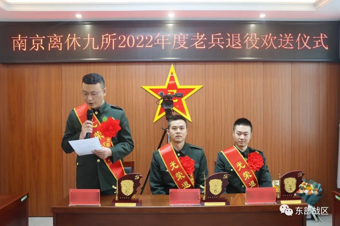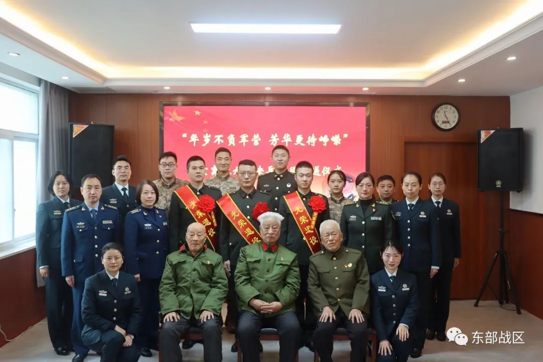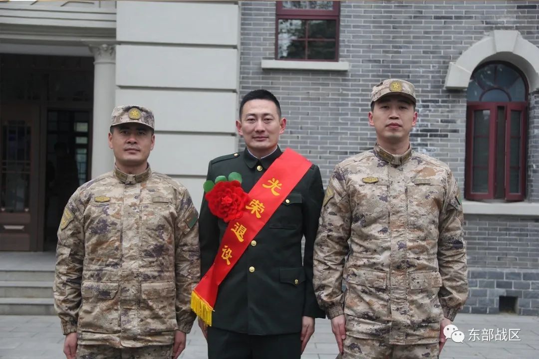 退役士兵身披绶带、胸戴红花