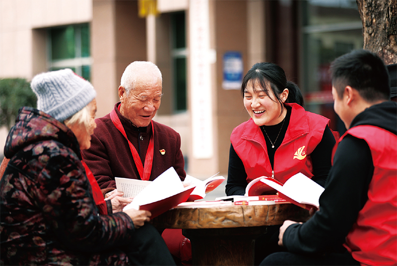 图为2022年11月18日,山东省临沂市郯城县郯城街道“90后”青年党员志愿者与龙泉社区“40后”老党员一起学习党的二十大精神。人民图片 张春雷/摄