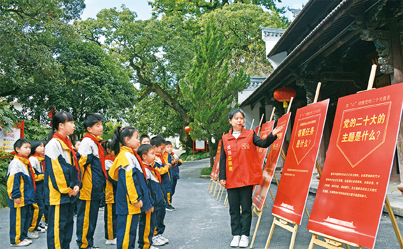 图为2022年10月25日,浙江省台州市上张乡中心小学的学生在中共仙居县委旧址纪念馆学习党的二十大精神。人民视觉 王华斌/摄
