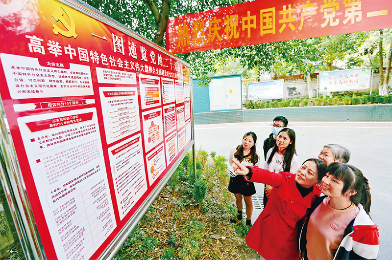 图为2022年10月18日,重庆市万盛经开区东林街道清溪桥社区,刚刚制作好的党的二十大宣传展板吸引了不少居民驻足阅览,热议并学习党的二十大报告。 视觉中国 王泸州/摄