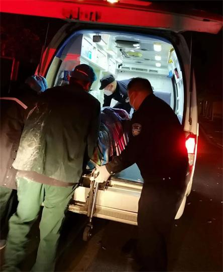 接到报警后,民警刘全斌带领辅警李金辉和钟春雷迅速赶到现场,病患一直有呕血的情况,现场情况十分危急!病患家属非常焦急,民警一边安抚病人家属,一边快速向医生了解情况。当了解到病患现不能直立上半身,需平躺送医救治,民警刘全斌决定通过抬起病患身下所铺盖的被褥将病患从六楼抬下。