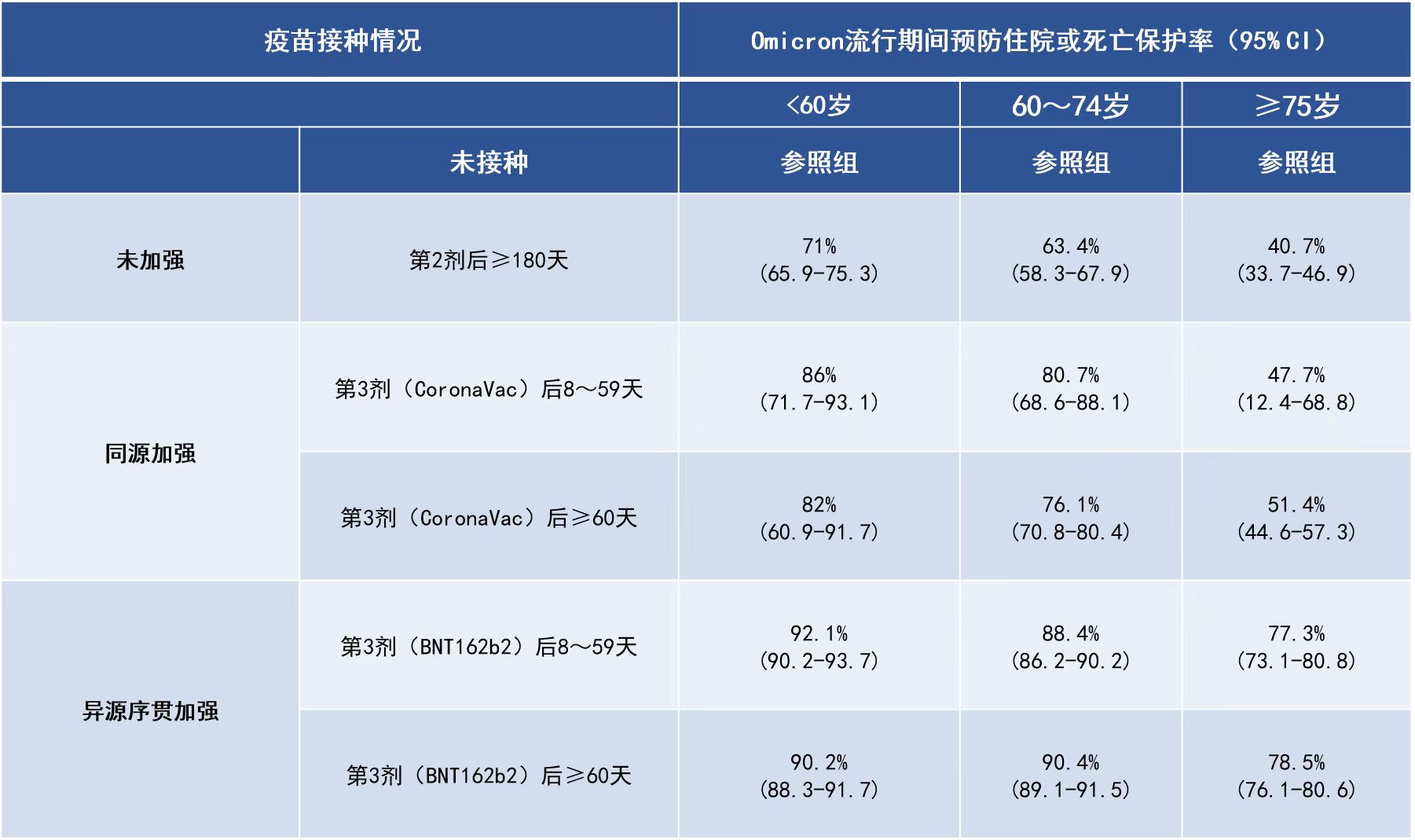 巴西一项研究证实,在Omicron流行期间,CoronaVac初始免疫6个月后,预防住院或死亡的有效性明显下降,尤其是≥75岁老年人群,保护率仅为40.7%,BNT162b2序贯加强接种后保护率明显提高[5]。