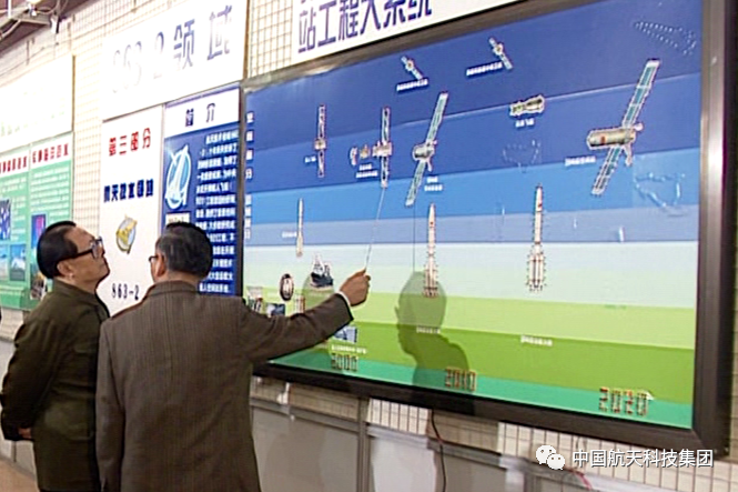 ▲ 江泽民同志(左一)听取我国载人航天工程规划介绍。在早期规划中,我国拟于2020年前后建成20吨级空间站。