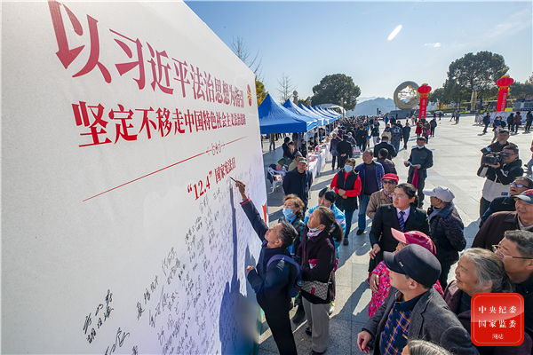 杭州市淳安县举办国家宪法日普法宣传活动,通过制作法律知识展板、现场设摊讲解等方式开展面向广大群众的普法活动,图为参加活动的群众在活动签名墙上签名。(杭州市淳安县纪委监委供 方雨昕 摄)