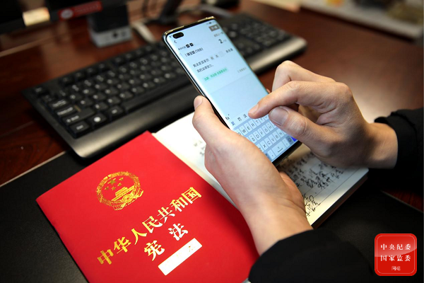 河南省新密市纪检监察干部通过学习强国平台,进行“宪法宣传周”专项答题,在题目中增强法律意识,弘扬法治精神。(河南省新密市纪委监委供 杨宗昊 摄)