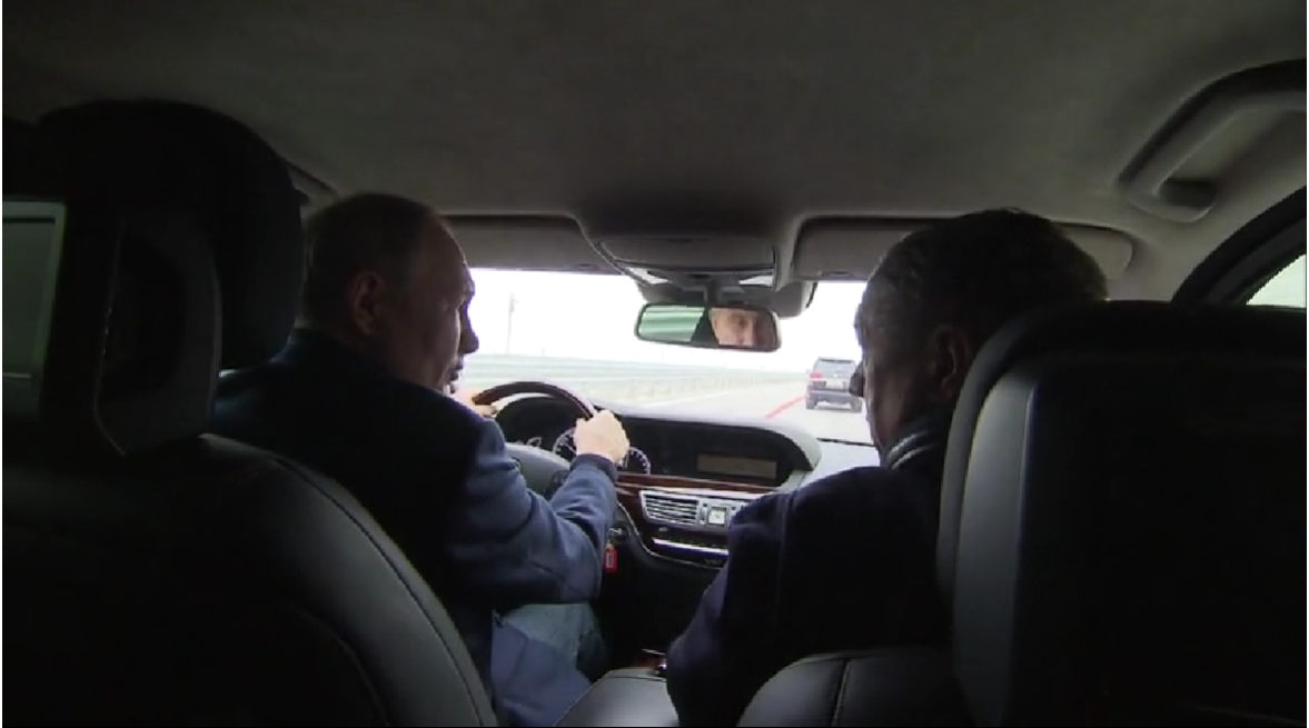 普京驾车驶过经修复后的大桥桥面 图自RT