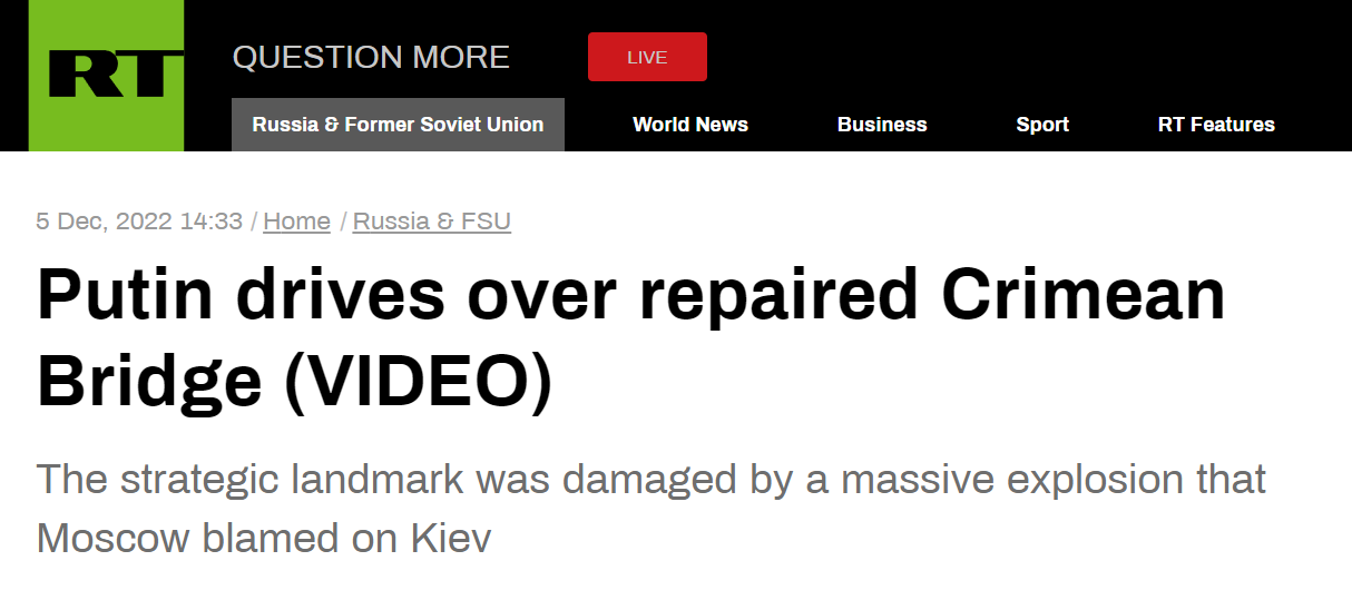今年10月8日,克里米亚大桥公路桥上一辆卡车发生爆炸,导致与公路桥并行的铁路桥上一货运列车上七个油罐被点燃;公路桥部分路段受损。在报道此事时,媒体几乎都提到克里米亚大桥对于俄罗斯非同寻常的意义:既是俄军关键的补给线,也是俄控制克里米亚半岛的象征。普京10月9日在听取俄罗斯侦查委员会主席巴斯特雷金就克里米亚大桥爆炸事件所做调查后表示,克里米亚大桥发生的爆炸是乌克兰特工部门策划和实施的,这是一起针对“关键民用基础设施的恐怖袭击”。