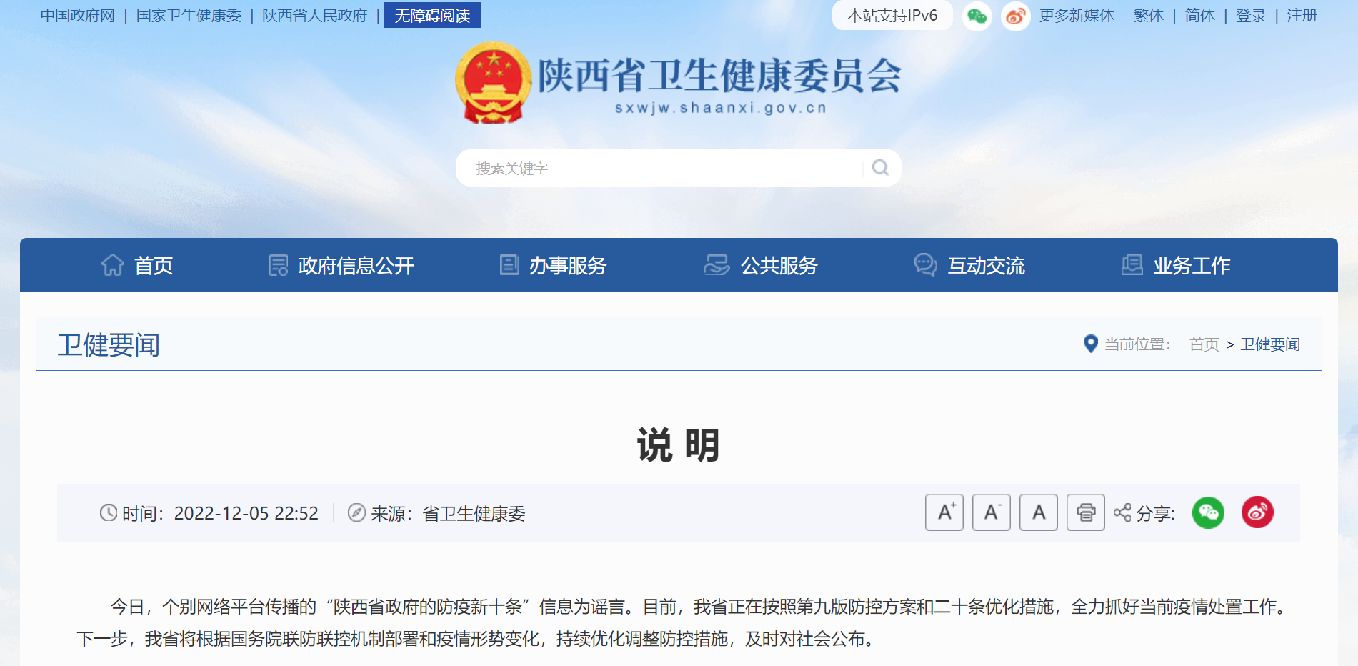 陕西卫健委12月5日发布说明表示,个别网络平台传播的“陕西省政府的防疫新十条”信息为谣言。