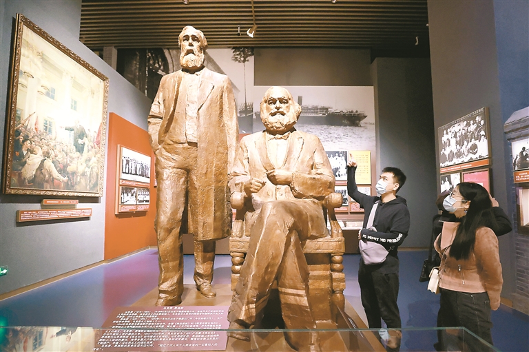 2022年10月9日,北京,观众在中国共产党历史展览馆参观马克思、恩格斯的雕塑。(图片来源:视觉中国)
