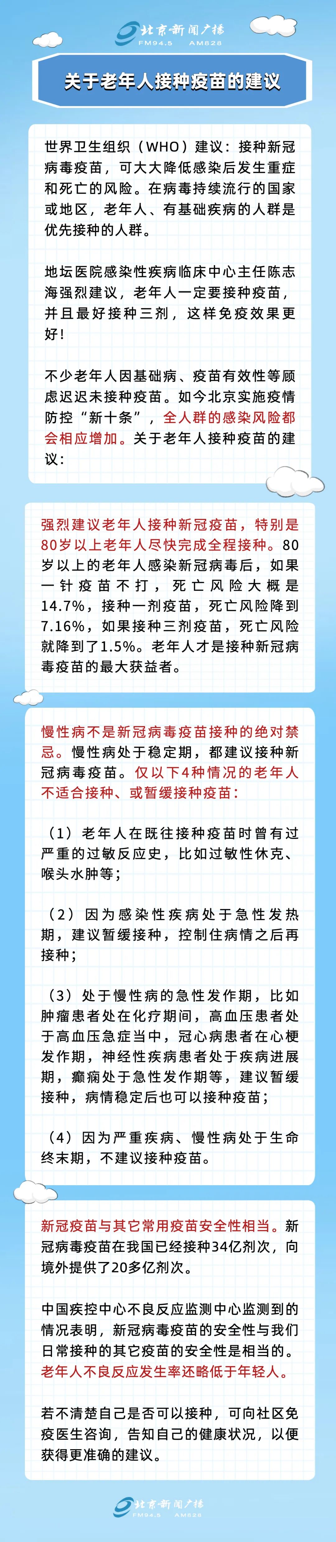 不少老年人因基础病、疫苗有效性等顾虑迟迟未接种疫苗。如今北京实施疫情防控“新十条”,全人群的感染风险都会相应增加。关于老年人接种疫苗的建议: