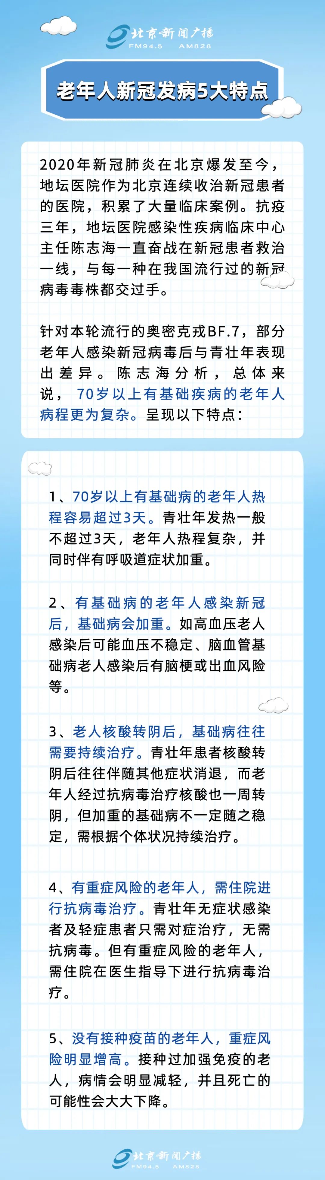 北京实行疫情防控“新十条”。具备居家隔离条件的无症状感染者和轻型病例一般采取居家隔离,也可自愿选择集中隔离收治。众所周知,老年人及有基础疾病的人群是新冠病毒重症的风险人群。老年人新冠发病有哪些特点?哪些老人感染后可以选择居家观察?哪些症状信号是“居家转住院的重要信号”?北京新闻广播记者采访了地坛医院感染性疾病临床中心主任陈志海。