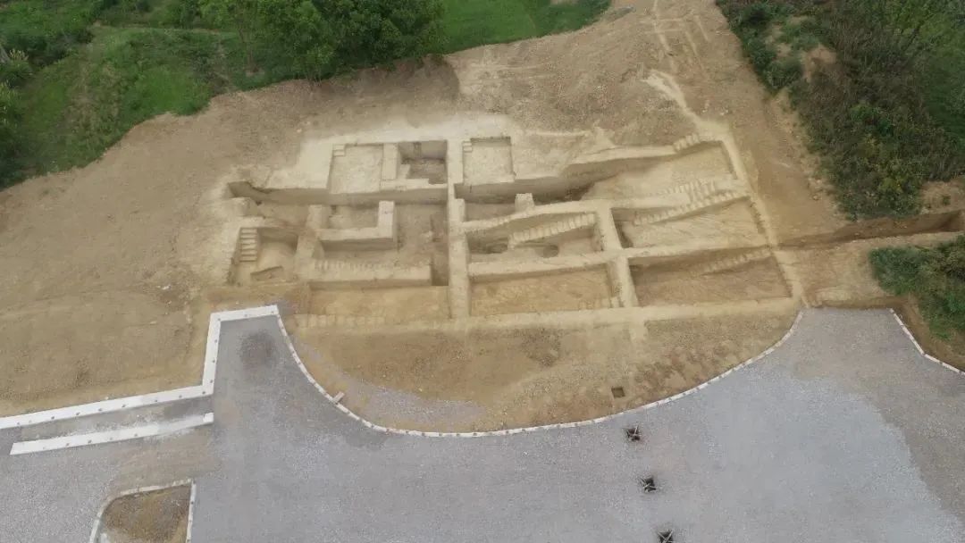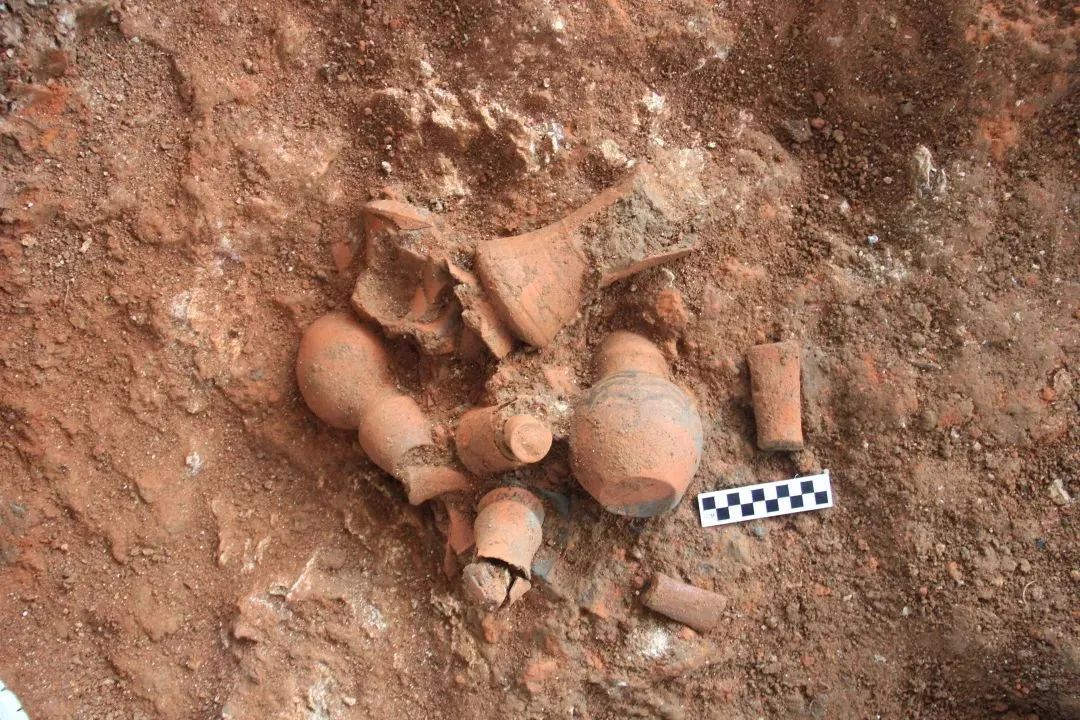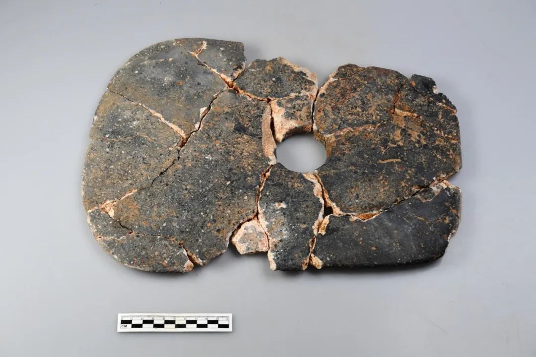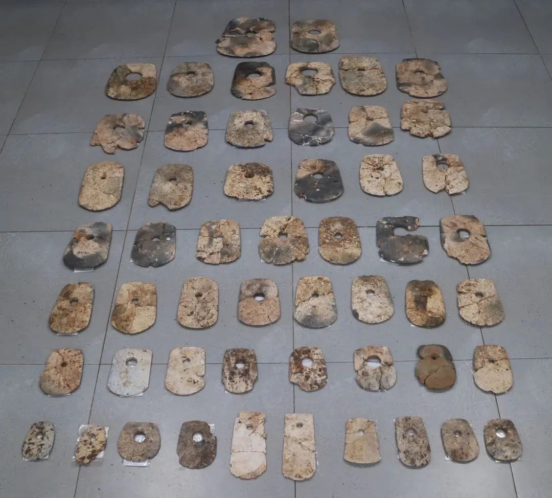 2021年10月—2022年4月,墓葬祭祀区西侧休息广场区域进行发掘,实际发掘面积327平方米,共发现新石器时代灰坑2个、祭祀坑1个、石头遗迹1处及汉代墓葬5座。祭祀坑平面形状呈圆角长方形,南北长4.1米、东西宽3.5米、深度32厘米,共出土器物260余件,其中石器140余件、玉器70余件、陶器40余件。