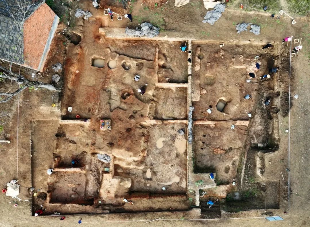 凌家滩遗址岗地东南角、内壕中部,以大面积的红烧土堆积为特点。此次揭露发掘,初步认为大型红烧土遗迹年代为凌家滩文化最繁盛的时期(距今5500—5350年)。红烧土分布范围平面呈长方形,南北长88米,东西宽40米,边界较直,东北角被明清堆积破坏,现存面积约2700平方米,复原总面积约3400平方米。