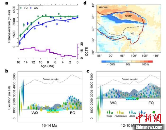 三是在喜马拉雅山和横断山脉,由于降水量显著增加,已增强当地植被和爬行动物的多样性,表明青藏高原东北部隆升引起的降水变化,影响到整个青藏高原区域的气候和生物演化。