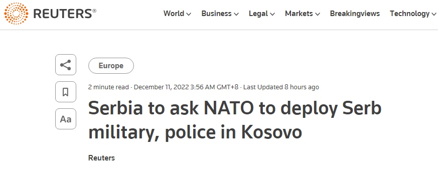 路透社:塞尔维亚要求北约(允许其)在科索沃部署塞尔维亚的军队和警察