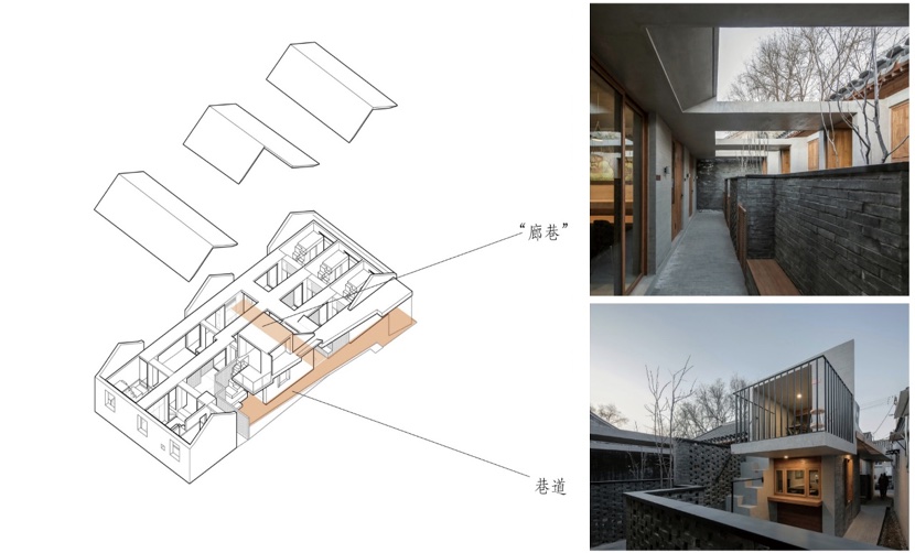 大院胡同28号周围的院落尺度大多是200至300平方米的四合院的尺度,而28号改造更新之后,变成了尺度更为缩微的社区,即由很多个小院落共同构成的城市和建筑之间的社区。这个社区里面有各种居住院落及生活空间,也有公共服务空间和廊巷系统。