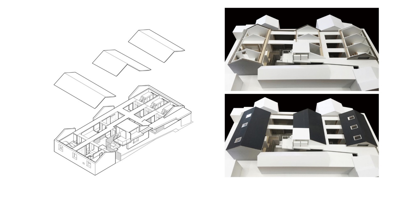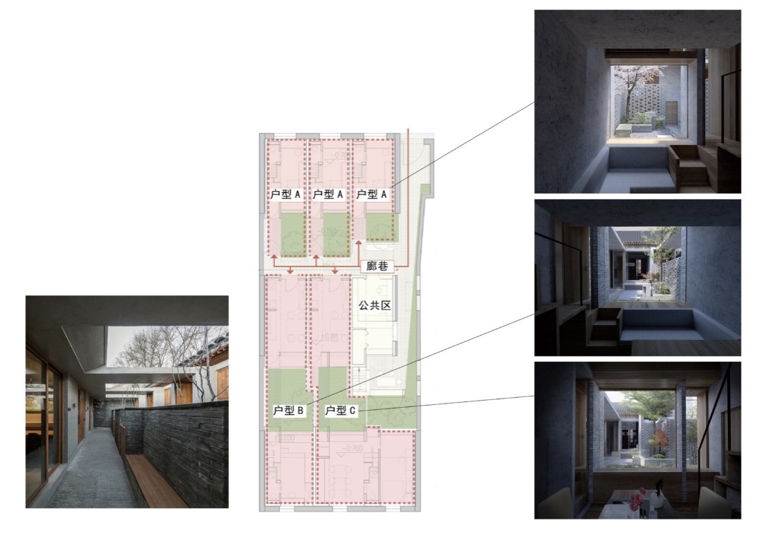 由连接到城市的交通道路大院胡同,延伸而来的半室外的巷道处理,实际上起到了一种类似公共交通道路“胡同”的作用,模糊了“城市”和“建筑”空间的界限。院落不再是传统的单一大家庭的院落,而是由承载了不同大小小型家庭的六个小型院落组成——由居住性院落和公共空间院落共同形成的一个城市单元。它既不是一个简单的建筑单元,也不是常见的大型城市单元,而是一个缩小了的城市和建筑之间的“微缩社区”。