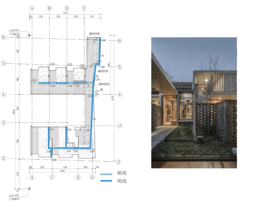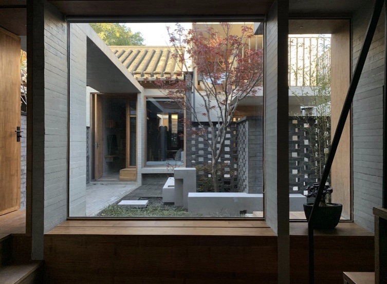 线型混凝土结构为主干的空间单元构成了内含于整体院落群组建筑的主要空间架构。这样的做法延伸到整个院落里面,形成了一个复合型的院落体系,一个有城市骨架感的院落系统。线状混凝土结构既是交通系统的依托,也是入口的檐廊,再延伸到室内成为卫生间、楼梯等服务空间。从胡同引入的分支巷道,串联起五个生活院落和一个公共空间院落。