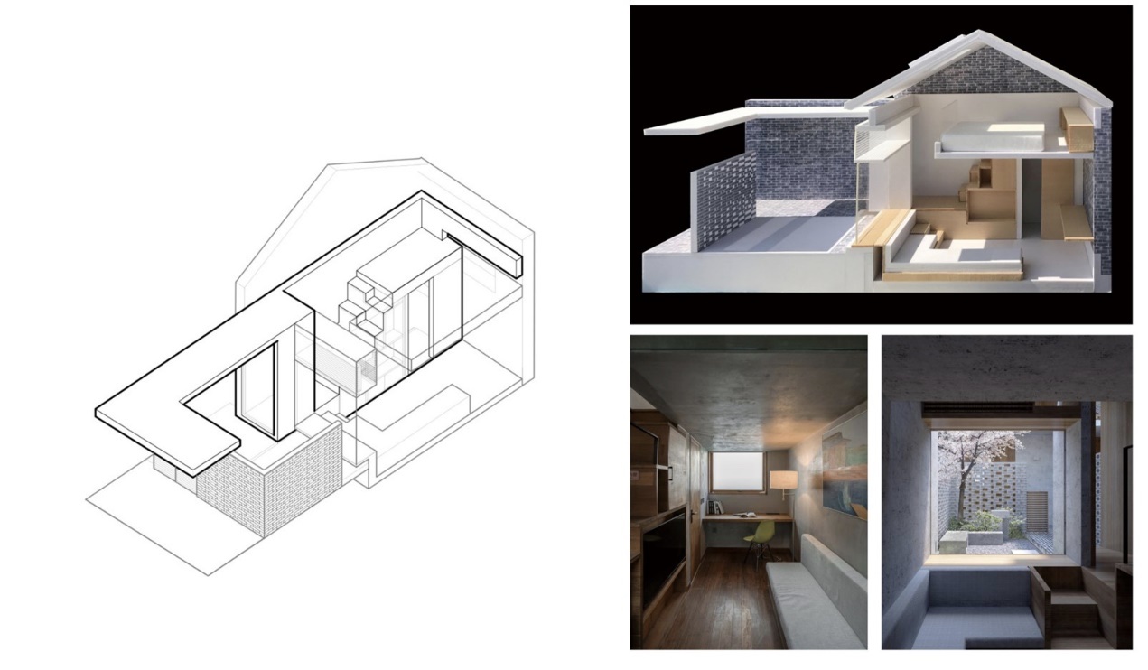 在建筑的整体高度不变的情况下,房间内部的地基下沉60厘米,多了这60厘米的高度就有可能增加生活空间,使内部分为上下两个空间,下面是起居空间,上面是卧室空间。下降后的地面标高正好落在原地基上表面,即在不触碰原基础的情况下,创造一个复合型的生活空间。室外是院落,这样成为一个最简的小合院。它由入口的檐廊、房间和半通透的围墙,共同构成。