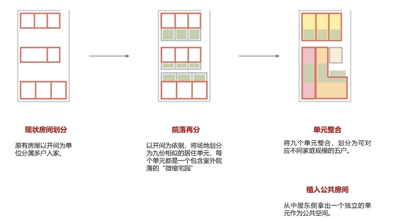 原来传统的四合院,是家族内部多个小家庭共享院落,后来变成不同形状的杂院——小家庭混居,通过加建挤占了院落空间成为大杂院;那么我们现在就是将大杂院在原状的基础上进行梳理,使之形成新的秩序,成为不同规模的小家庭宅院组成的加密院落群。