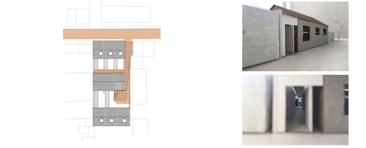公共空间包括其园林的设计,依托于交通性的廊巷,服务于各个小院落。它成为公共服务设施,例如胡同里食品店一样的存在,为院内各户甚至28号以外的居民提供咖啡、早餐等公共服务的空间。廊巷顺应胡同的社交法则,对四面邻居的高窗进行友好避让。入口檐廊(主巷道)的顶板由北至南不断变窄,在东墙一侧退让出一条狭长光带,保障邻居窗口的采光通风,也从光线上进行暗示行进的方向。另外,水电、空调等核心设备同样可以暗设在公共区域统一管理并分接入户。