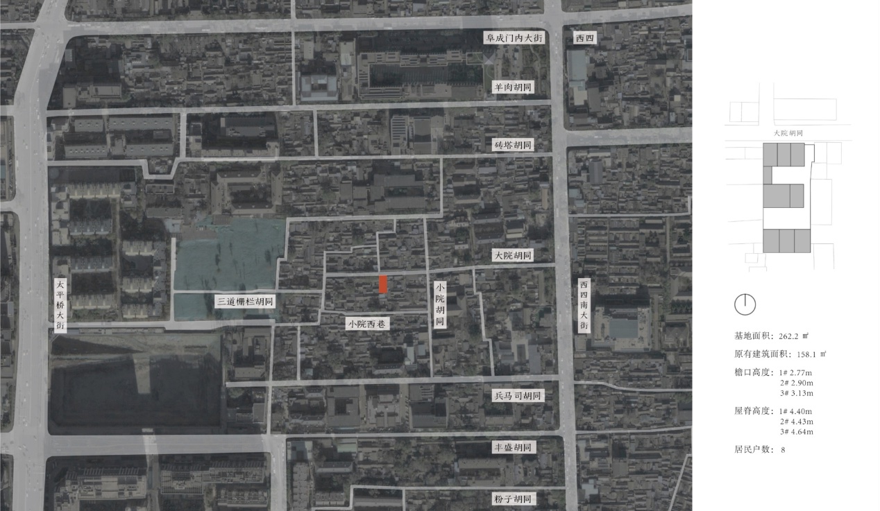 它位于北京的西单附近,政协礼堂以东,西四南大街以西的一条胡同,项目基地是一个沿街的200多平方米小院子,曾经是大杂院,清理之后留下旧的三排房,这些房子并非是有价值的老建筑,而是经过很多年使用之后形成的状态。按照北京旧城保护规划要求,这三排房子的高度、沿街立面、开窗形式,甚至建筑本身的檐口处理,都不能轻易改造。