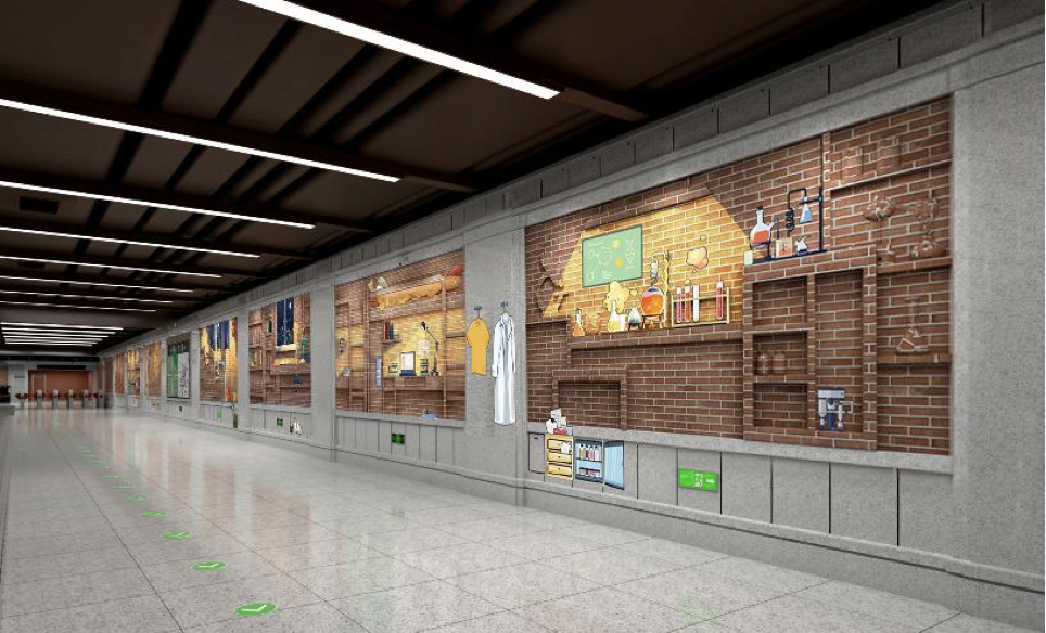 学知园站站厅墙面的一组艺术品以“青春校园”为主题。“在校园生活中,不同的场景承载着我们太多的回忆。从校门到图书馆、从篮球场到自习室、从宿舍到实验室等等,这里包含学子们丰富的大学生活。”设计说明显示,方案通过“砖”与“光”的结合,营造大学生活氛围,“光”的介入也传达了学子们的人生态度,勾起学子们的回忆。