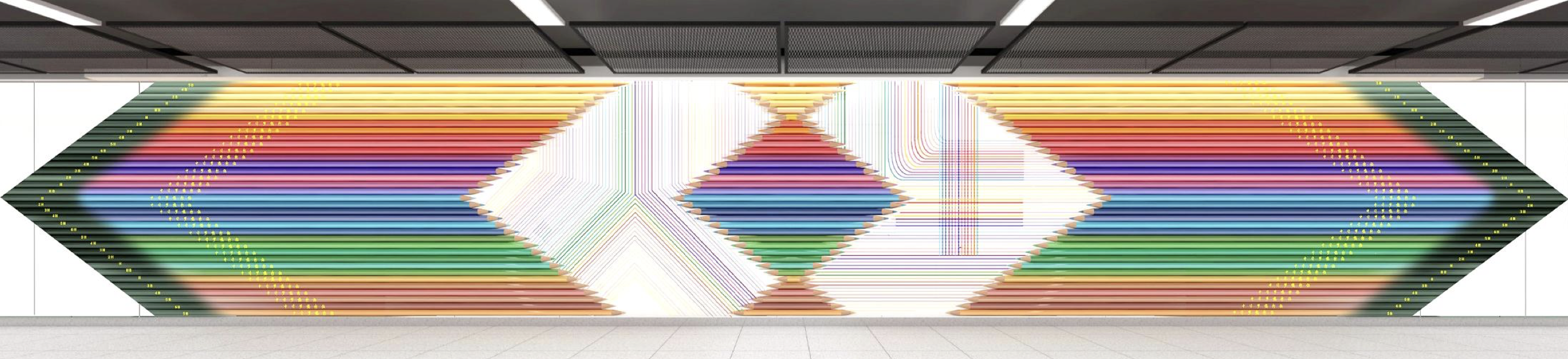 站厅墙面的另一幅作品题为“绘彩人生”,采用彩铅的创意。每一个颜色都独一无二,每一支画笔都缺一不可,不同的粗细轻重好似不同的性格,只相互配合,才能画出美丽的画卷。