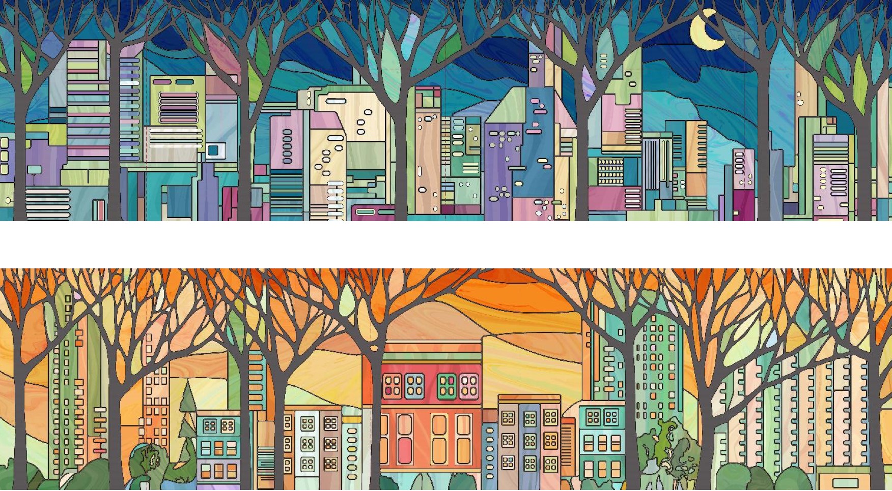 清河小营桥站的站厅墙面围绕“交织的梦想”主题,同样聚焦于当代青年。色彩缤纷的画面分别描绘了校园与城市商务楼宇,代表了青年上学与工作的场景,高反射材质构成的“树”融入画面,可以与乘客在行进过程中产生视觉互动,带来“人在画中游”的感官体验。