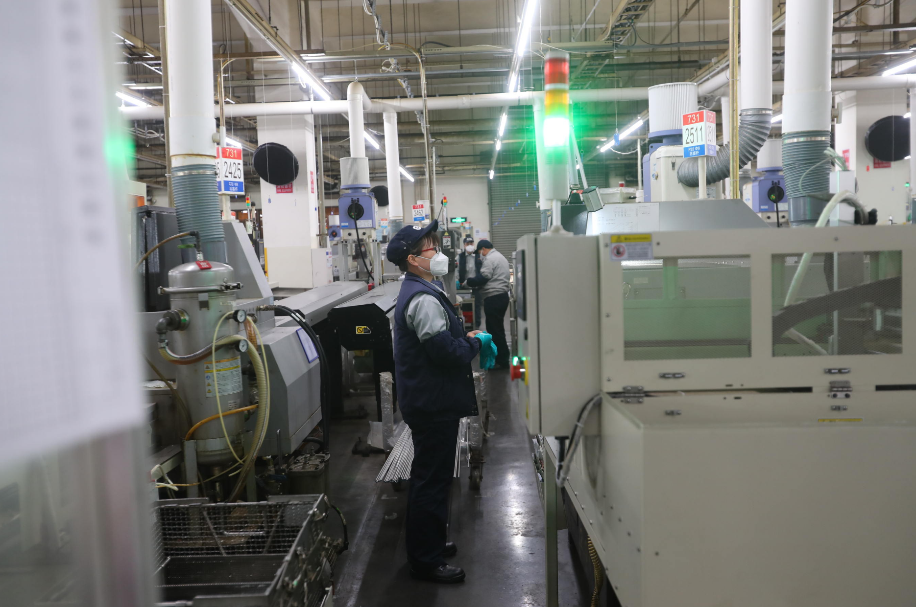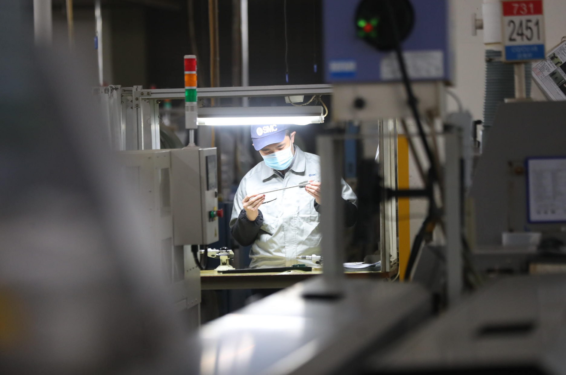走进位于经开区的SMC中国有限公司二工厂,活塞杆、缸筒、端盖等气动元件的生产线正在忙碌运转,代表紧急生产供应的粉红色、蓝色生产随行票据,插满了各条生产线。