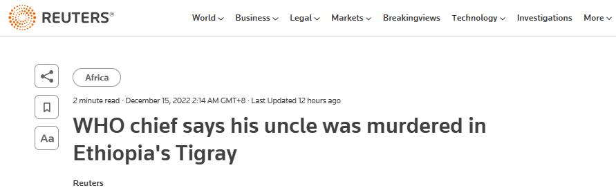 路透社:世卫组织总干事说,他的舅舅在埃塞俄比亚提格雷被谋杀