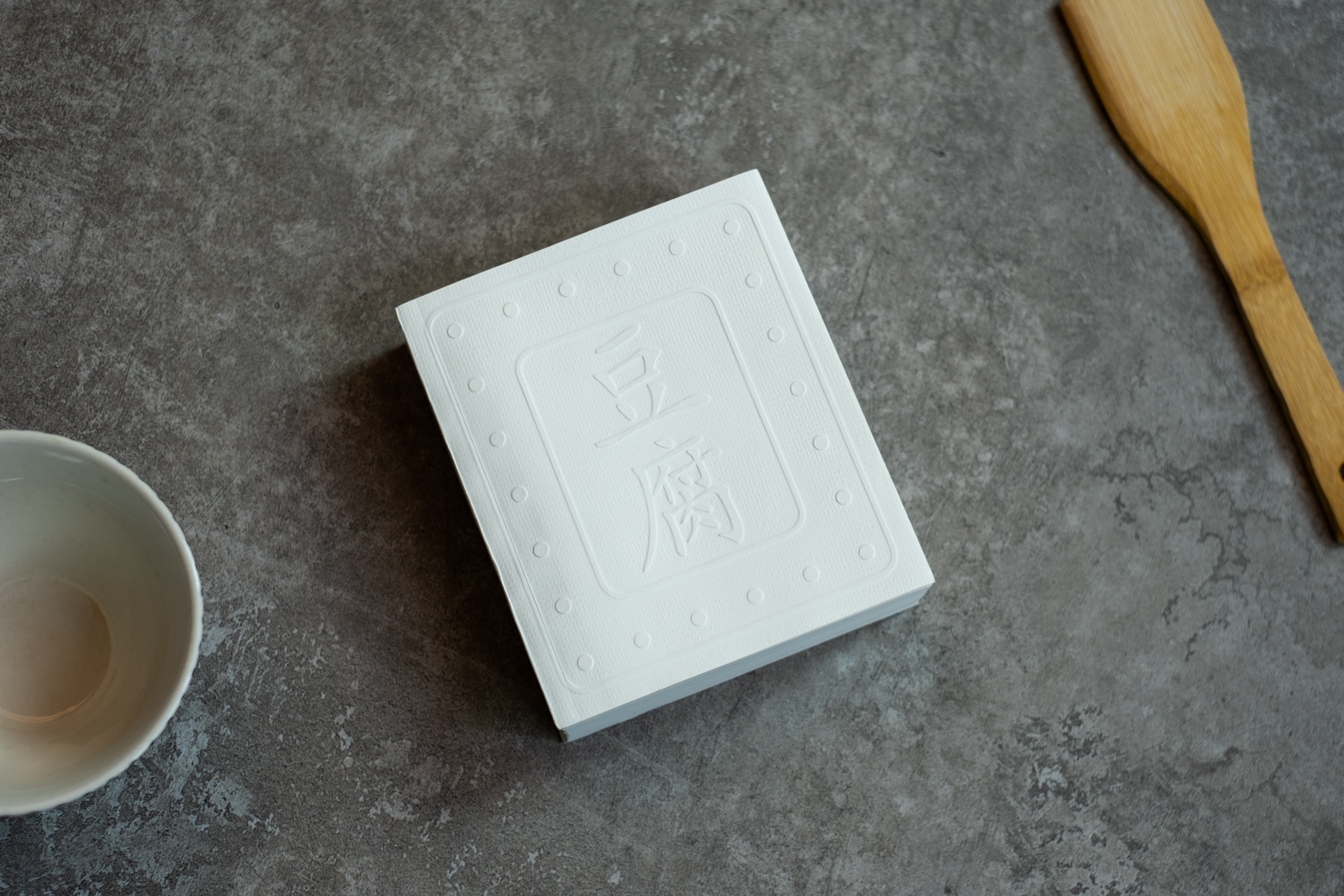 《豆腐》的外观就是一“块”实实在在的卤水豆腐,封面采用浮雕起鼓工艺,模拟豆腐表面纹理,高度仿真。翻开来,滑润、轻薄、透亮的纸张让读者一下子会联想到嫩滑的豆腐质感。朱赢椿揭秘,为了做这本书,他从市场特意买来豆腐,仔细观察,最后做出来的书和豆腐一个尺寸。制作豆腐要用纱布压制,在豆腐上留下纱布纹理,朱赢椿在封面设计过程中,则采用了凹凸工艺。“我们买来纱布,将其扫描下来,再把凹凸的板子做出来,在印制的时候,把纹路印在纸上,就变成了纱布纹理,摸起来就像是豆腐的样子。”