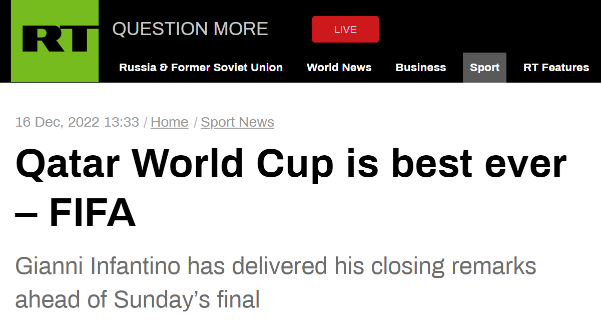 RT:国际足联(主席因凡蒂诺)称,卡塔尔世界杯是有史以来最好的世界杯