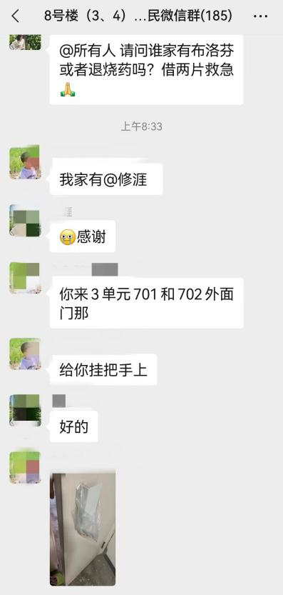 “请问谁家有布洛芬或者退烧药,借两片救急。”“我家有,给你挂门把手上。”“请问谁家有多余的水银温度计?能借我用几天吗?我的电子温度计出问题了,读数不准。”“我有!”在望泉西里南一、南二、南三社区、梅兰家园社区等的居民群里,居民自发在居民群中为急需用药的邻居朋友提供药物,小小的举动解决了邻居用药难的问题,传递了社区正能量,温暖了人心。大家都由衷地感慨:“远亲不如近邻,能遇到这么多的好邻居真幸福!”