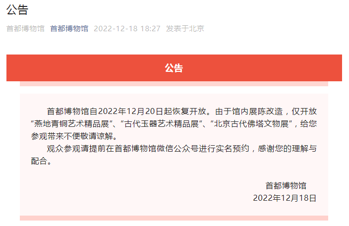 据首都博物馆微信公众号消息,首都博物馆自2022年12月20日起恢复开放。由于馆内展陈改造,仅开放“燕地青铜艺术精品展”、“古代玉器艺术精品展”、“北京古代佛塔文物展”,给您参观带来不便敬请谅解。