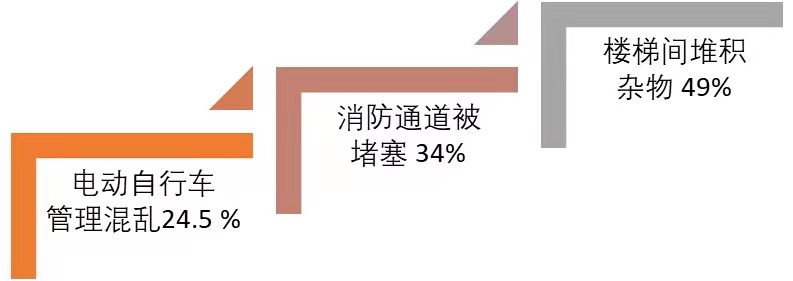 受访居民认为,杂物堆积、消防通道堵塞是居住区主要消防隐患。被问及所居住社区的消防安全隐患时,受访居民提及率较高的是楼梯间堆积杂物(49%)和消防通道被堵塞(34%),此外还反映电动自行车管理混乱、飞线充电、消防器材损坏、遗失或过期等问题。