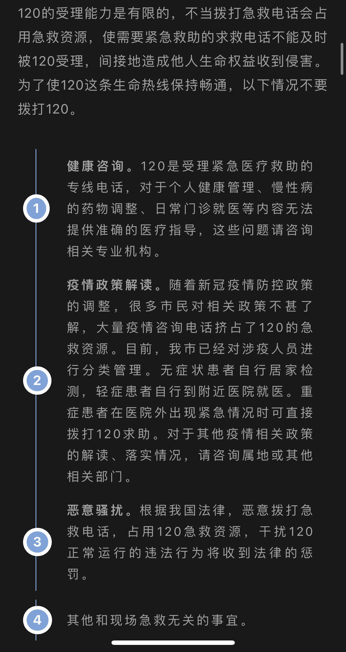 随着疫情持续,北京市120急救电话在12月9日遇到了一天3.1万次的历史最高呼入量,是常态时的6倍。疫情防控政策不断优化调整,截至12月16日,每日接听量下降至2.3万次,但其中仍有大量询问药物购买、疫苗接种、发热治疗的咨询电话,急救中心工作人员呼吁非紧急情况请勿拨打120,为真正有需要的群众让出“生命热线”。