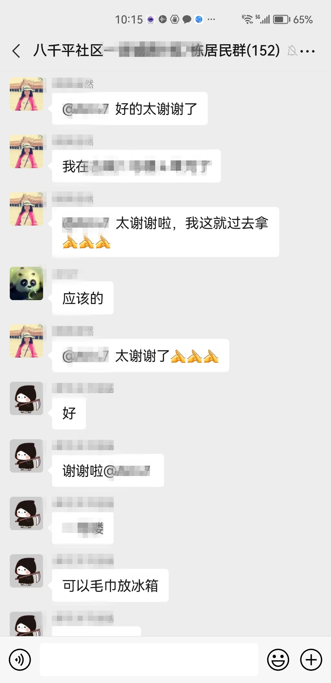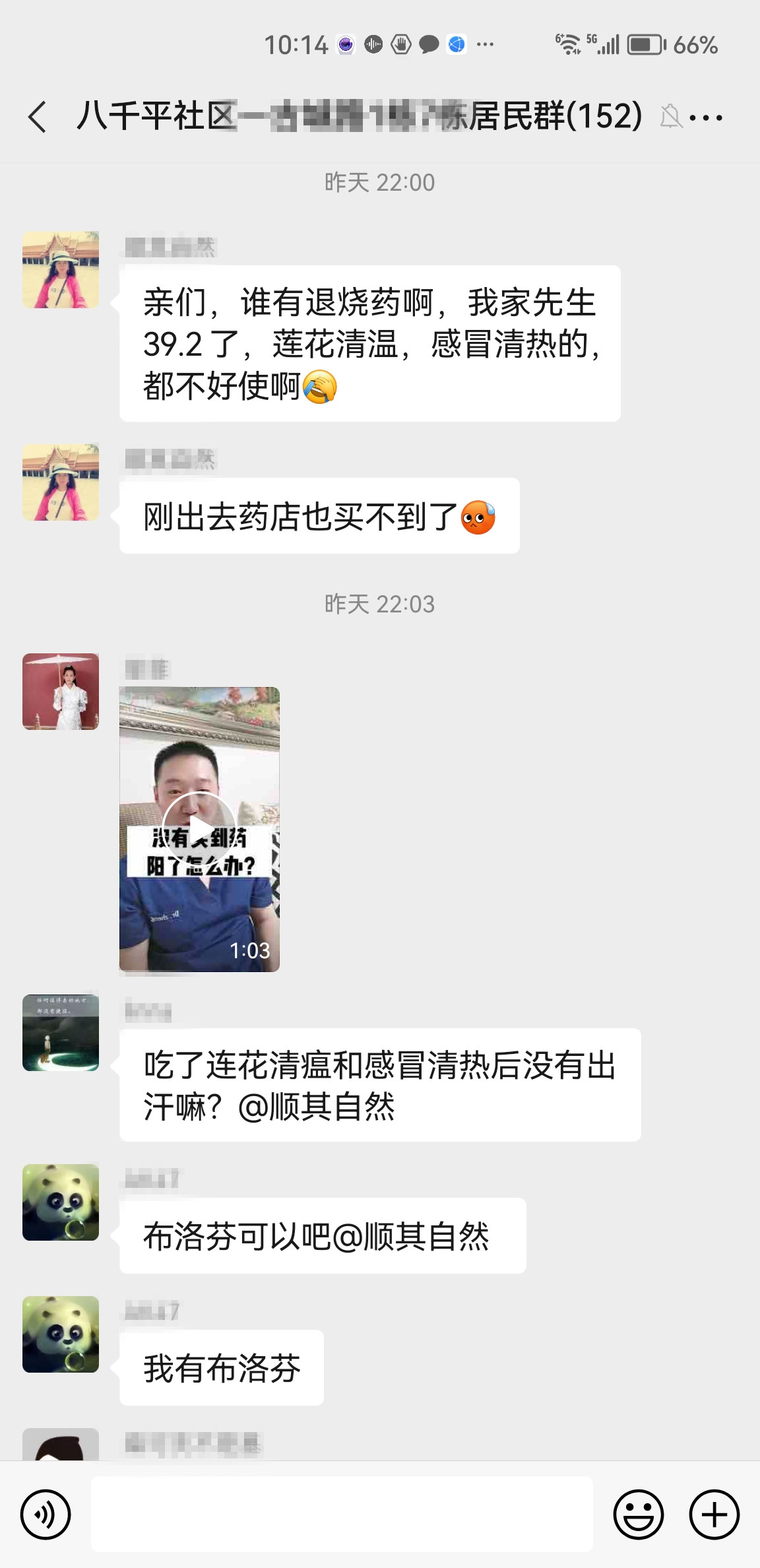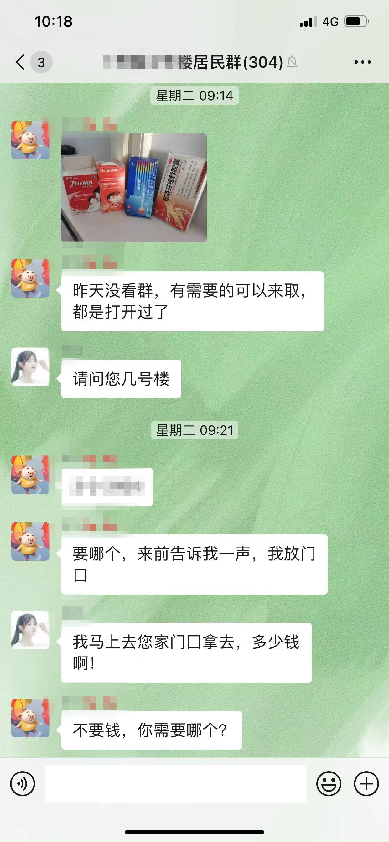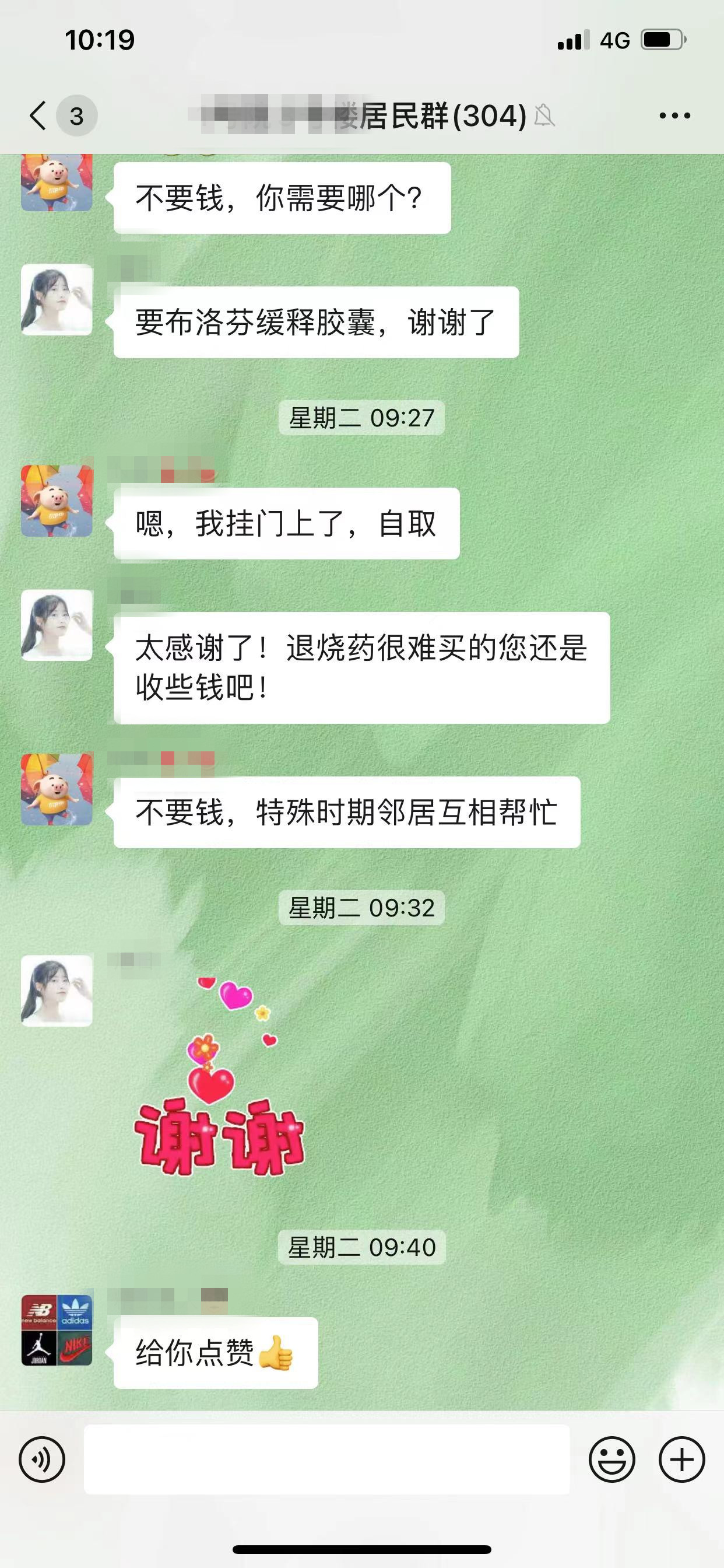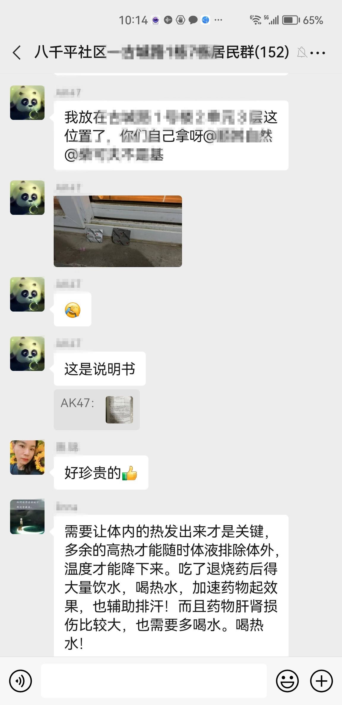 “亲们,谁有退烧药呀?我先生一直高烧不退,药店也买不到了。”一条求药信息在八千平社区群里弹出,邻里们马上开启了接龙式回复,“我这有布洛芬,放在楼道里了,谁需要过来拿就行”“吃了退烧药也要大量喝水,及时补充体内水分”“可以把毛巾放在冰箱里冰镇一下再用,退热很好用。”为了缓解邻居们的买药难问题,邻里纷纷献策,拿出家里多余的退烧药与邻居们共享,并将退烧方法发到社区居民微信群里。越来越多的邻里在群内互帮互助,收获了满满的邻里情。