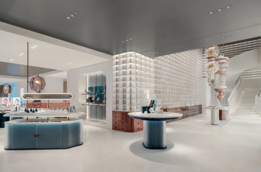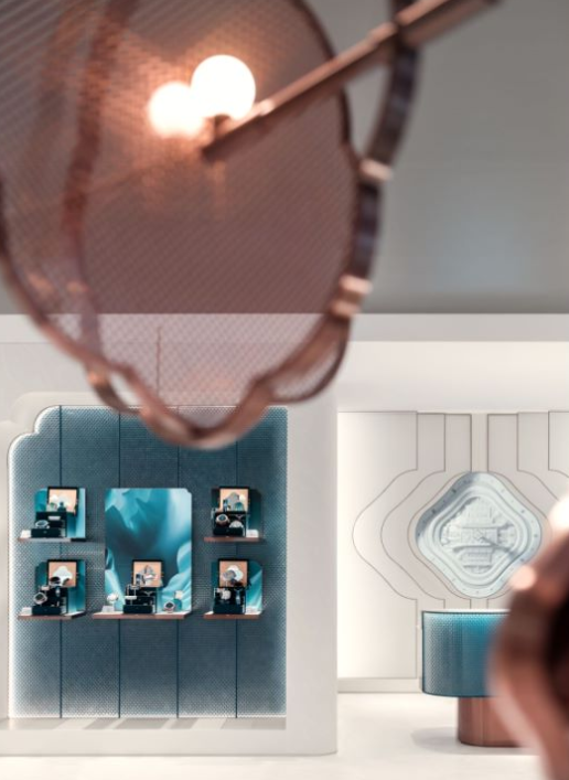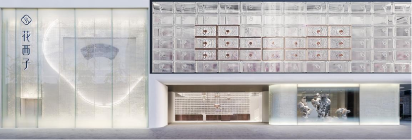 为呈现出疏密有致、移步换景的效果,店内空间采用障景、框景、对景、藏景等中国园林造景手法。如采用框景的手法的“候月窗”;采用借景的手法“弄影屏”等。曹林娣教授说:“其实在中国古代,修园林的人,大多都为了更优雅地隐居,区别于现在大家说的‘躺平’,这是一种非常积极、自在、淡泊、雅致的生活态度,正如花西子对东方文化的传承与赋新,是形隐神现、贯穿始终。”