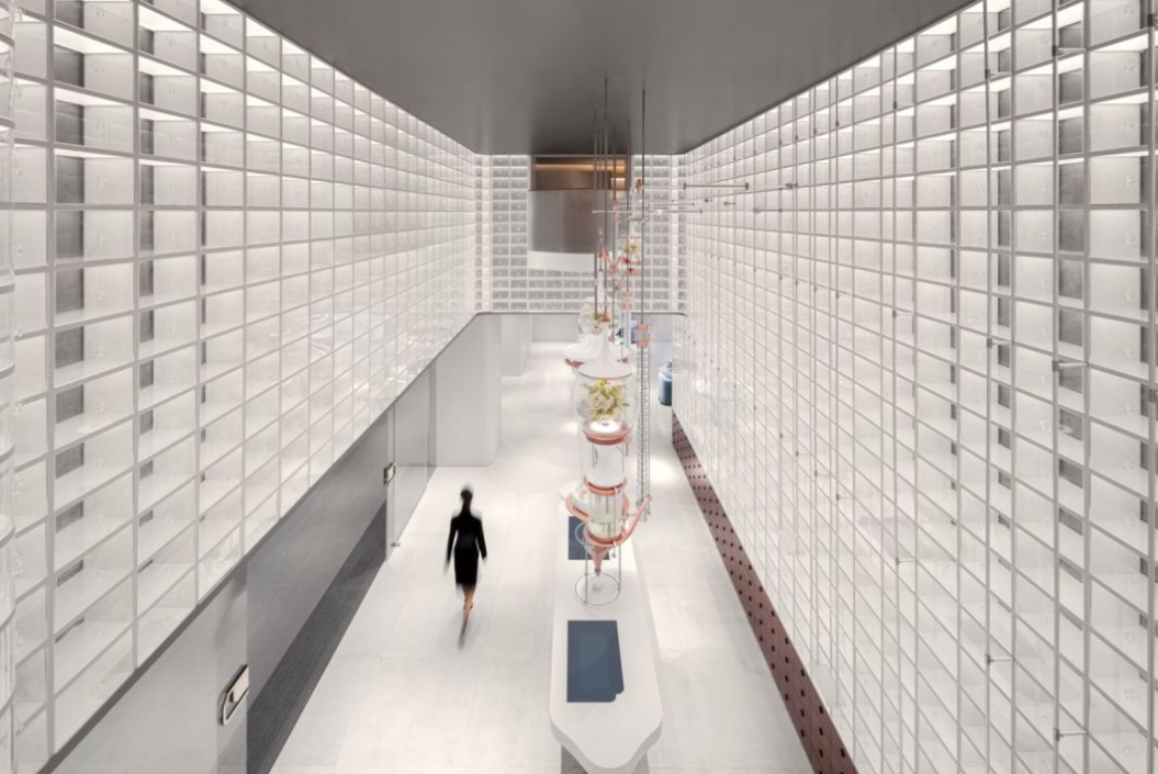 来到隐园,极具东方感特色的艺术氛围贯穿整个空间。外立面“花影壁”与“观山境”,尽显东方浪漫气息;缓步入门,是极具视觉冲击的大型艺术装置——百花厅,由整面墙的干花百子柜与大型的花卉萃取装置组成。花西子对中药店内存放药材的柜子“百子柜”进行解构演绎;通透材质让整体视觉更具现代时尚感,萃取装置彰显现代美妆科技之美。