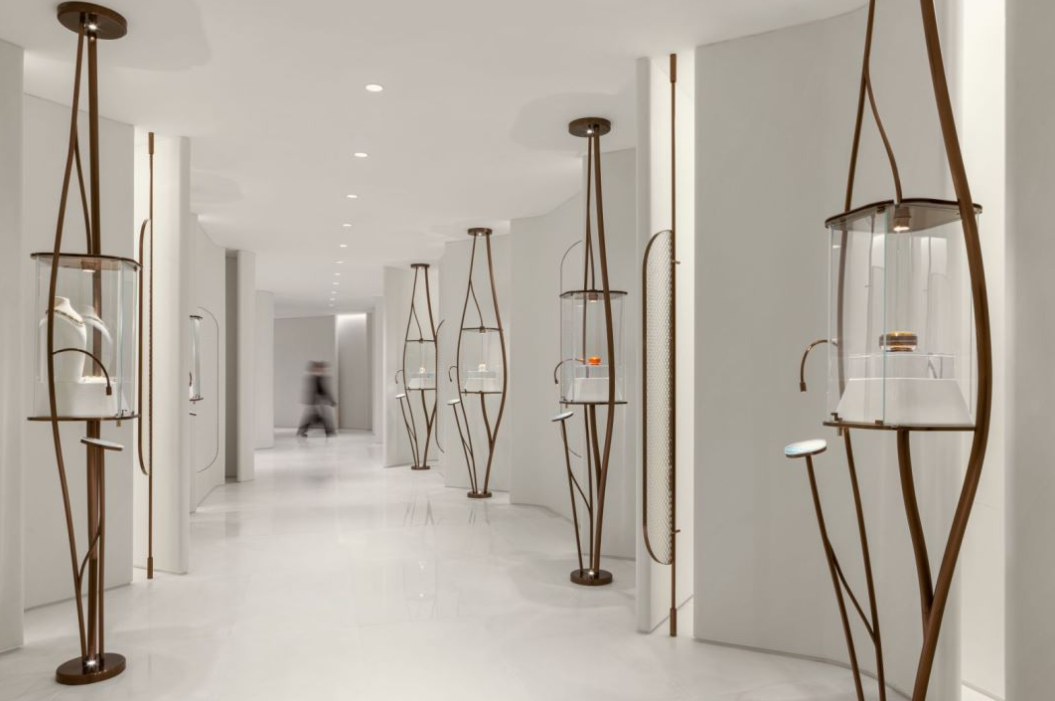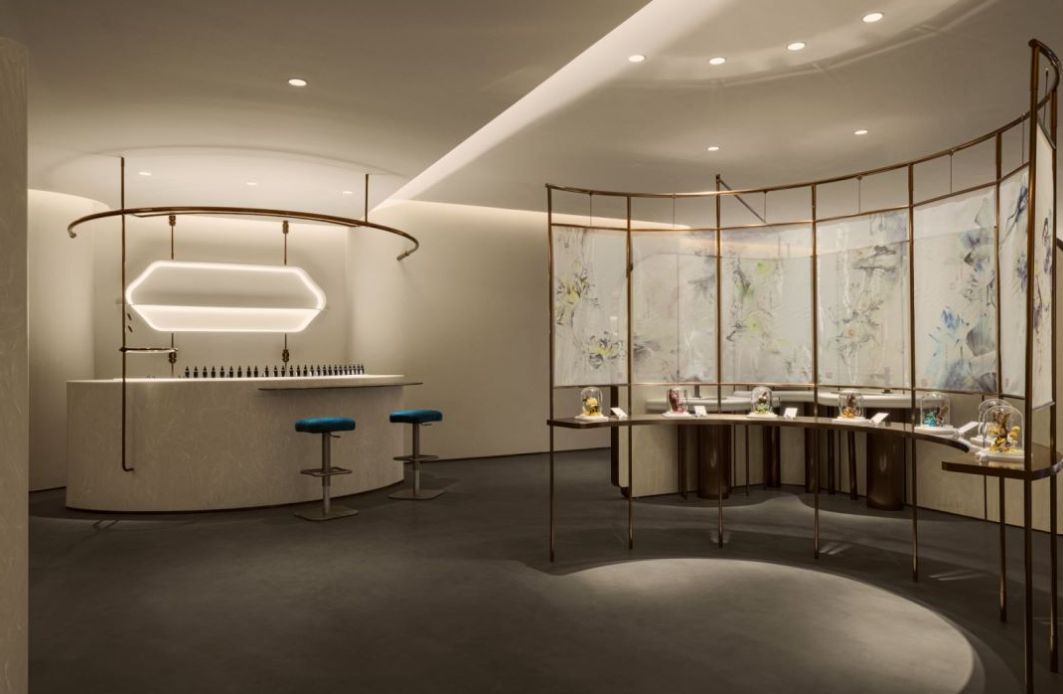 步入二层,独具匠心的艺术高定区“吉光涧”会定期展出丰富艺术藏品。黄金花丝工艺、漆器、鼻烟壶等,均由中国经典传统工艺打造。“我们希望在这个店里有一些留白,有一些灵活的空间,定期组织一些艺术展出活动,同时也是为中国青年艺术家和非遗艺术家的作品提供更好的展示空间,这是一种多方受益的模式。”花西子空间创新研究中心负责人说。