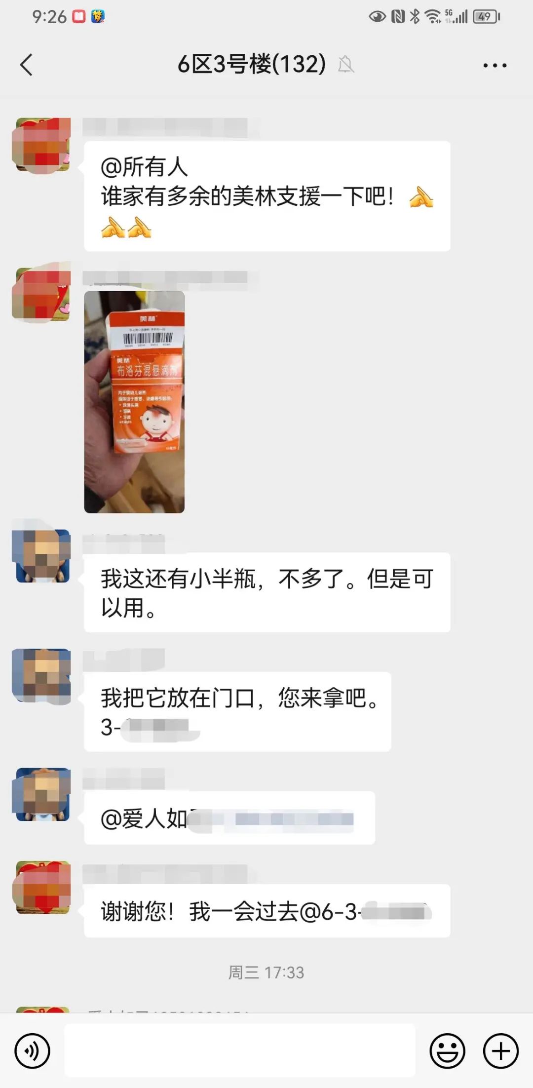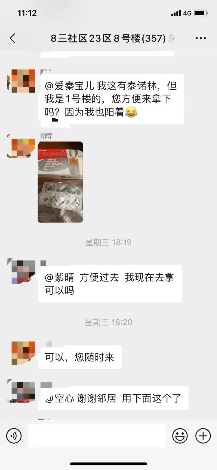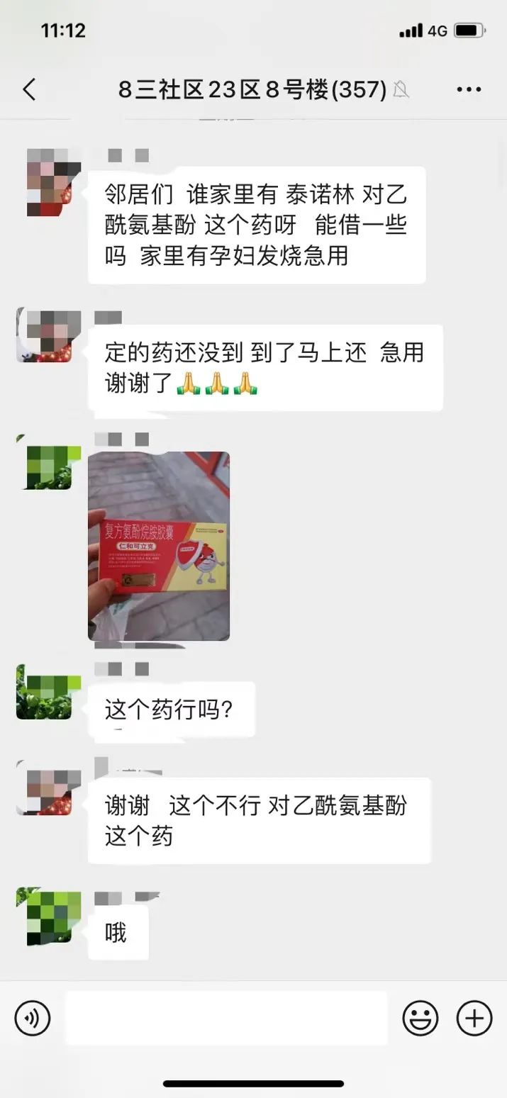 “不好意思求助大家,我爱人现在孕晚期,请问谁家有泰诺林?”“谁家有孩子吃的退烧药?”……声声求助换来的是暖心救急,“放家门口了”、“我私信您地址”……没有明码标价,没有计较得失,在各社区微信群中,大家“零接触式”分享家中富余的药品,防护意识也是十分到位,在冬日里讲述着一个个“众人拾柴火焰高”的暖心故事。